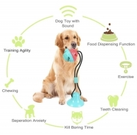 O jucărie din material puternic și durabil, rezistent la mestecat. Echipat cu o ventuză puternică care poate fi atașată ferm de podea. Datorită designului său special, ajută la curățarea dinților și gingiilor animalului dvs. de companie, promovând dinții sănătoși. Compartimentul din interiorul mingii poate fi umplut cu dulceata.
